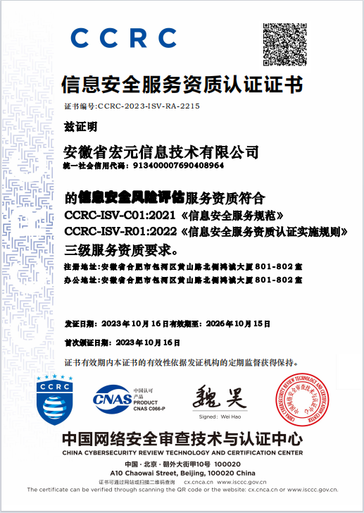 近日,省水電公司所屬安徽省宏元信息技術(shù)有限公司通過了由中國網(wǎng)絡(luò)安全審查技術(shù)與認(rèn)證中心頒發(fā)的CCRC信息安全服務(wù)資質(zhì)認(rèn)證。本次獲得CCRC信息安全服務(wù)資質(zhì)認(rèn)證證書,是宏元公司資質(zhì)儲備工作的又一階段性成果,證明宏元公司在信息安全管理方面已建立了一套科學(xué)有效的管理體系,在信息安全服務(wù)領(lǐng)域獲得了行業(yè)權(quán)威肯定,在信息安全服務(wù)、技術(shù)服務(wù)能力更上新高。