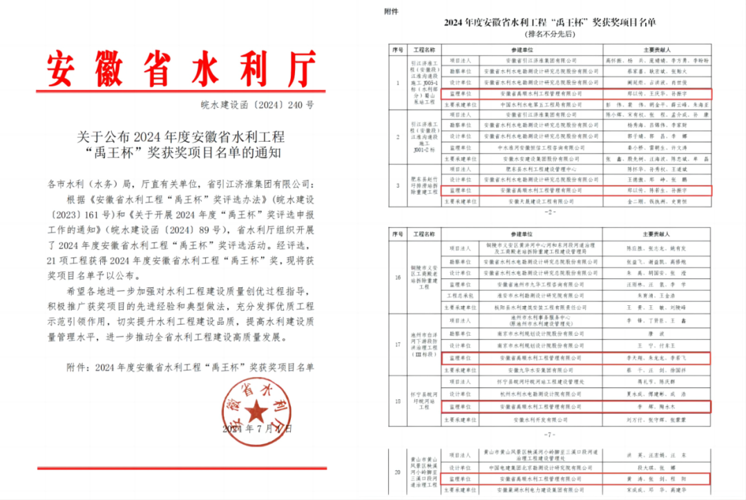 7月2日,省水利廳公布了2024年度水利工程 “禹王杯”獎獲獎項目名單,此次共評選出21個水利工程獲獎項目,省水電公司所屬禹順公司負(fù)責(zé)監(jiān)理的引江濟(jì)淮工程(安徽段)江淮溝通段施工J005-1標(biāo)(水利部分)蜀山泵站工程等5個項目榮膺該獎項,這是該公司繼多次獲得大禹獎、黃山杯等榮譽(yù)后,再次在水利工程監(jiān)理領(lǐng)域得到的高度認(rèn)可,進(jìn)一步證明了禹順公司在行業(yè)內(nèi)的技術(shù)實(shí)力和項目管理能力。