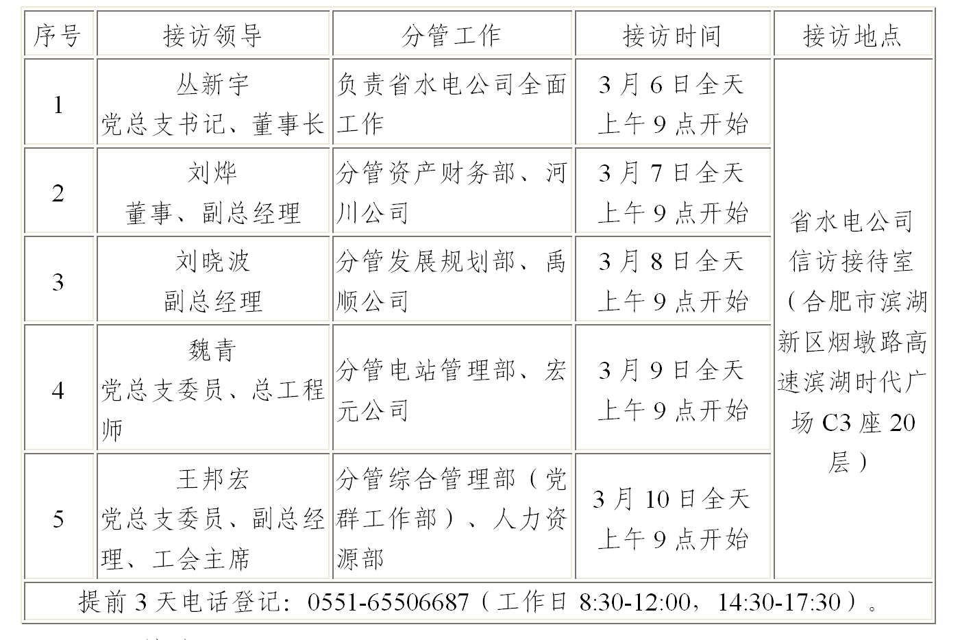 根據(jù)工作安排,省水電公司領(lǐng)導(dǎo)班子成員3月份接待省水電公司系統(tǒng)職工群眾來訪,信訪職工群眾可通過電話方式提前預(yù)約登記?,F(xiàn)將有關(guān)安排公示如下: