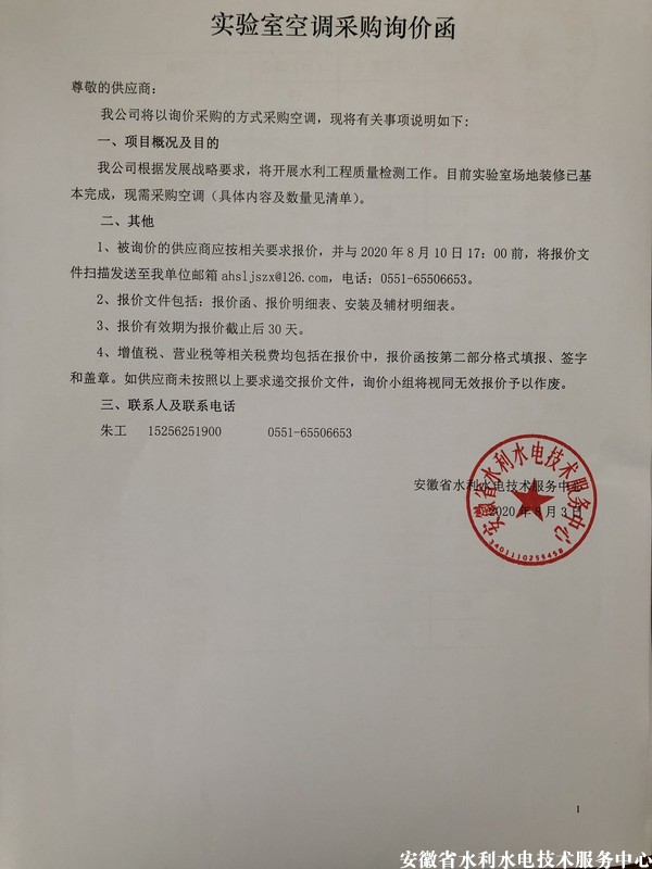 安徽省水利水電技術(shù)服務(wù)中心試驗室空調(diào)采購詢價函