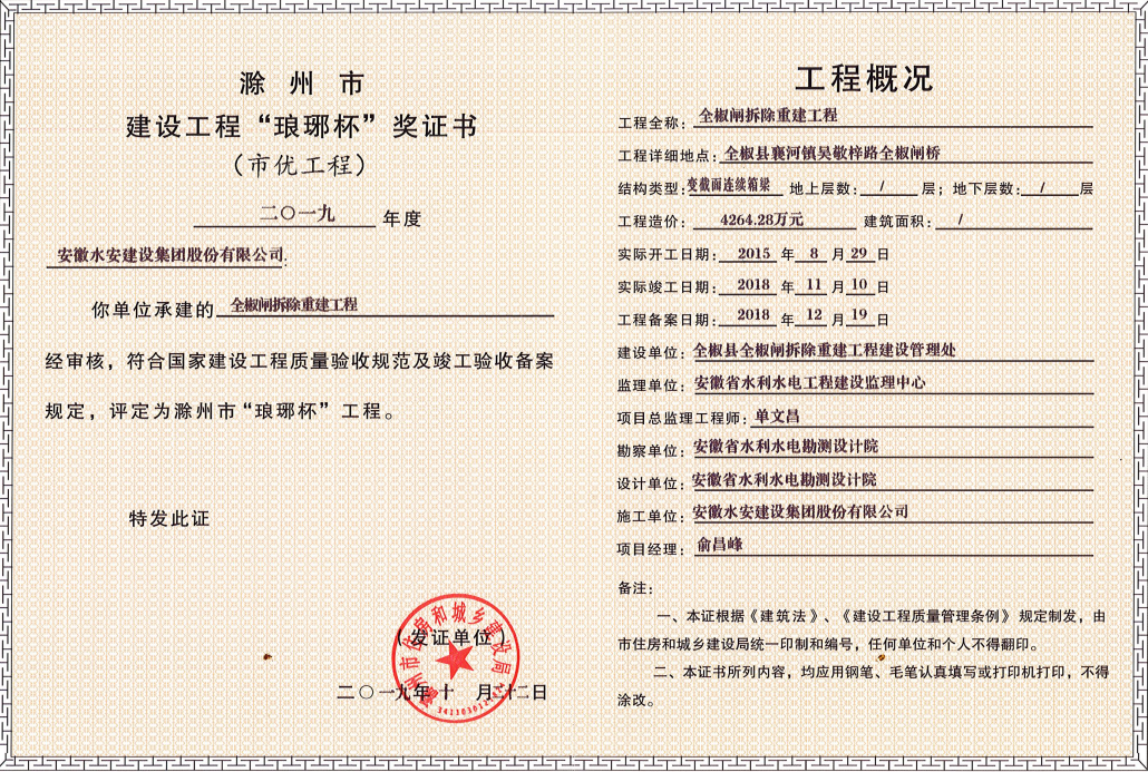 2019年10月22日,安徽省水利水電工程建設(shè)監(jiān)理中心監(jiān)理的全椒閘拆除重建工程榮獲滁州市建設(shè)工程“瑯琊杯”獎(市優(yōu)工程)。